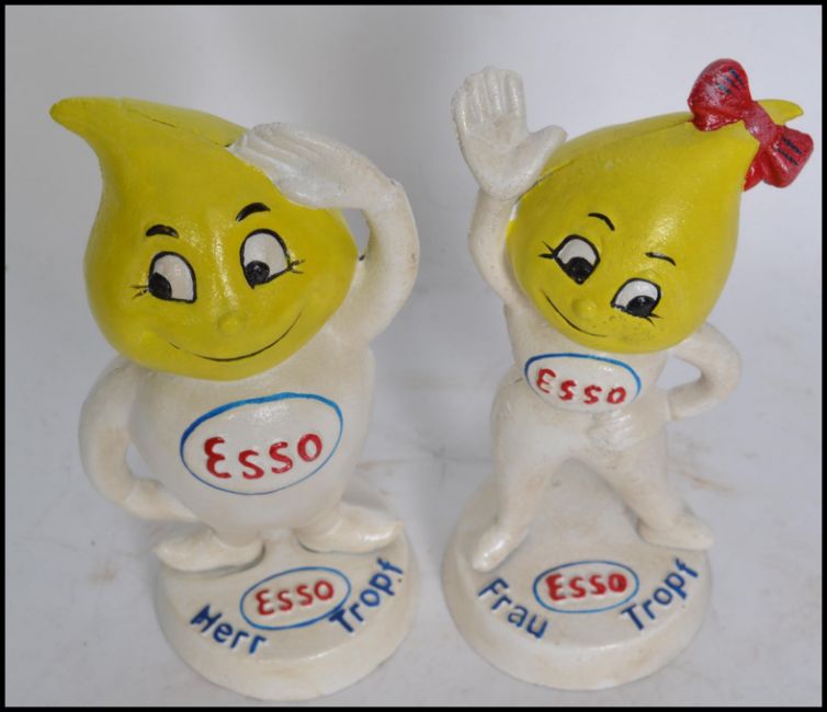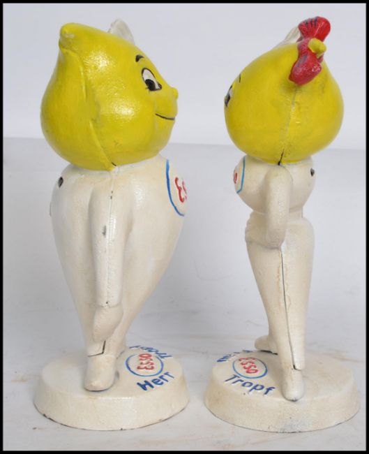 A pair of vintage cast iron advertising point of sale Esso money banks in the form of lemon headed figures raised on plinth bases with notation for Frau and Merr Troph. Measures:  23cm high.