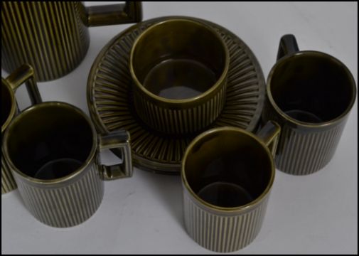 A retro 20th century vintage 6 person coffee service by Ellcreave Tiko in green consisting of 6 cups and saucers, creamer jug, sugar bowl and tall coffee pot. Measures: 17cms high.