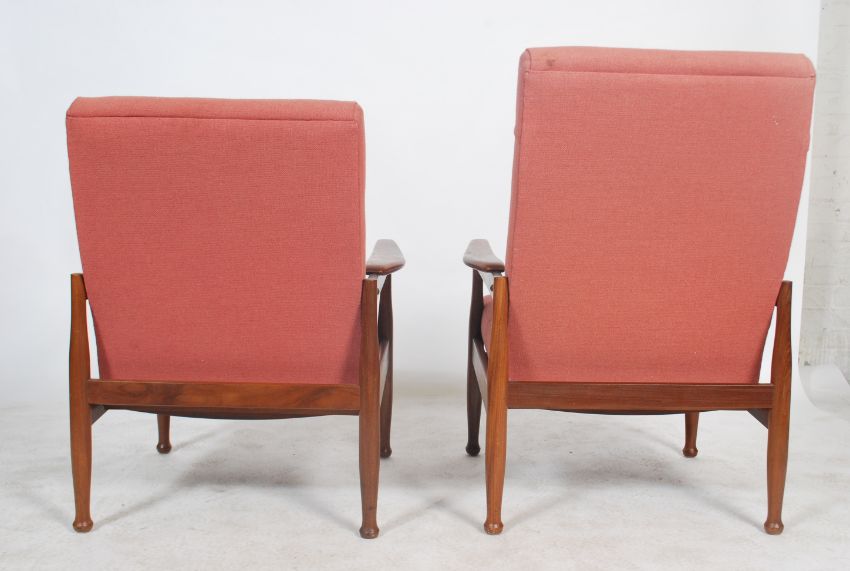 A pair of original  mid century / 1970's possibly Guy Rogers 'Manhattan chair', teak and velour upholstered armchairs. The chairs being raised on tapered supports with show wood angled arms having good original velour upholstered seats that recline.