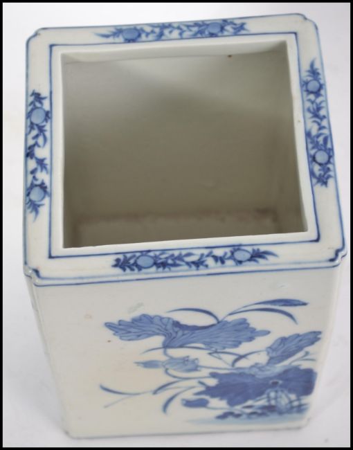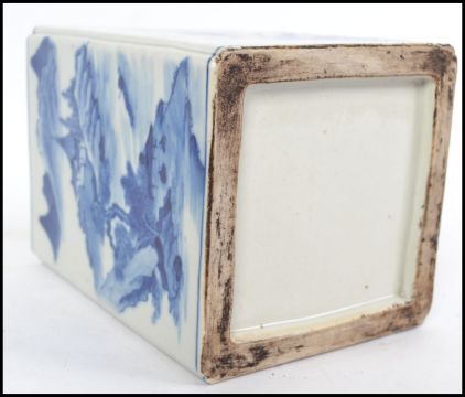 A believed 19th century Oriental blue and white ceramic brush pot of large square form, each side depicting a different scene to include still life, landscape and people. Measures 18cms high.