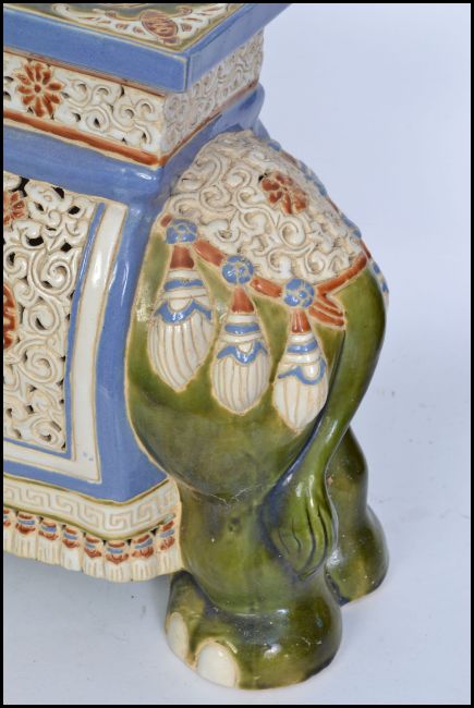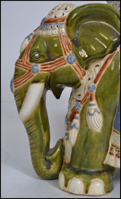 A large elephant ceramic plant stand in green white and blue with plinth top dating to the 20th century