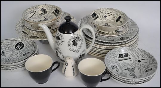 A large collection of retro 20th century Ridgeway Homemaker ceramics to include a coffee pot, tazza cake stand, two cups and saucers, 5 sandwich plates, 10 bowls, 1 sugar bowl, 10 large dinner plates, 1 cake plate and a pepper pot condiment.  Condition Report: Tazza has had repair, coffee pot has repair to handle, chip to base of one cup, two of the bowls have a chip, and three of the sandwich plates have chips. Measures:    19cm high.