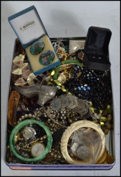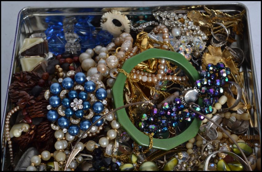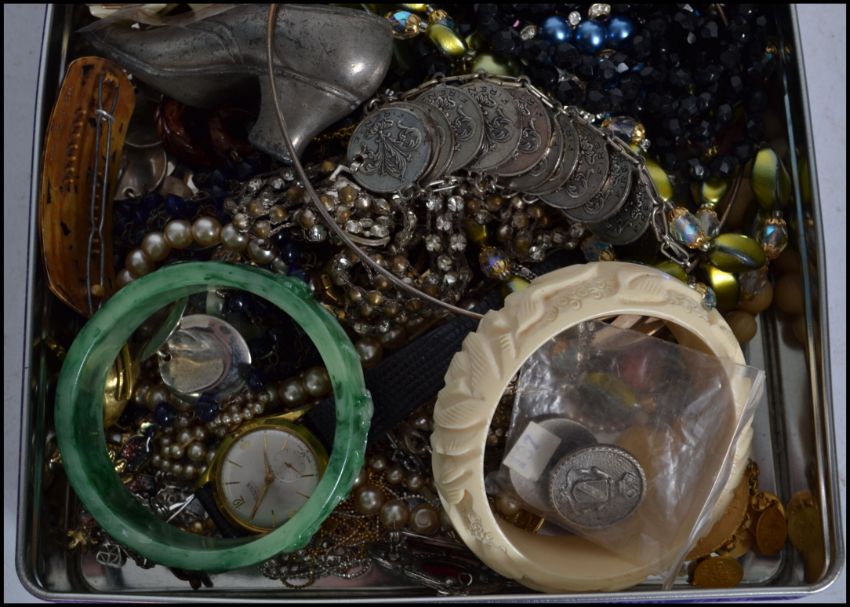 A good collection of vintage costume jewellery to include celluloid bangles, rhinestone necklaces, coin bracelet, watches, earrings etc. Please see images.