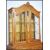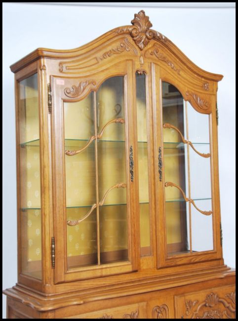 A large French 20th century oak vitrine display cabinet. Raised on shaped cabriole legs with cabinet under tall glass display cabinet with twin doors and shelved interior