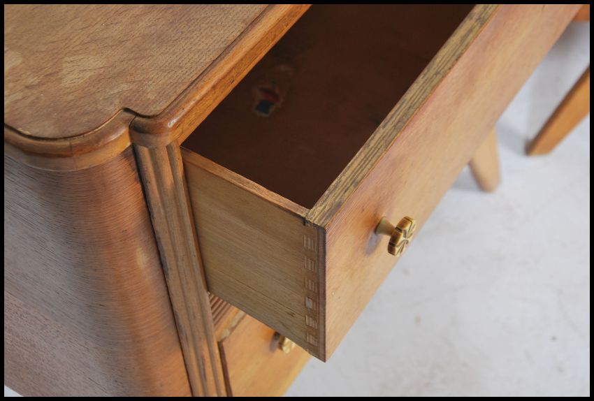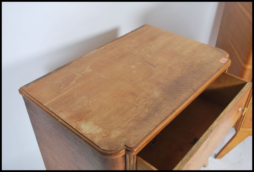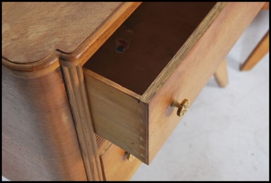 A 1930's Art Deco oak chest of drawers and matching dressing table, each being raised on tapering legs with a series of drawers having bow fronts. Dressing table has mirror above