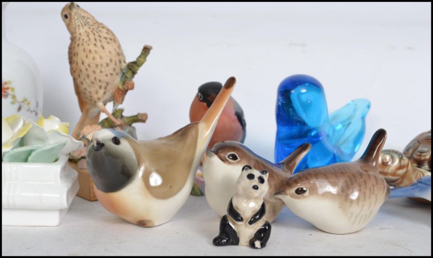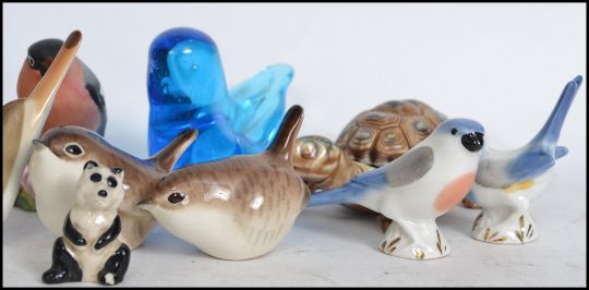 A good group of miniature ceramic animals to include a Royal Worcester 3238 Bullfinch, wrens, wagtail, thrush, a bluebird of happiness signed paperweight, a Wade tortoise, a Limoges perfume bottle and a Royal Doulton posy basket.Measures: 14cm high.