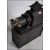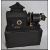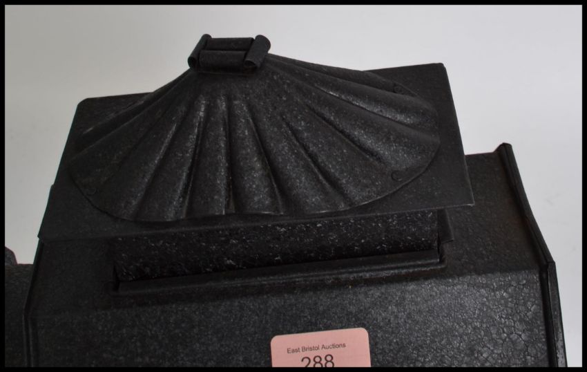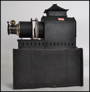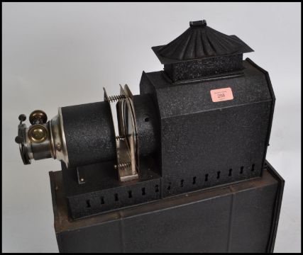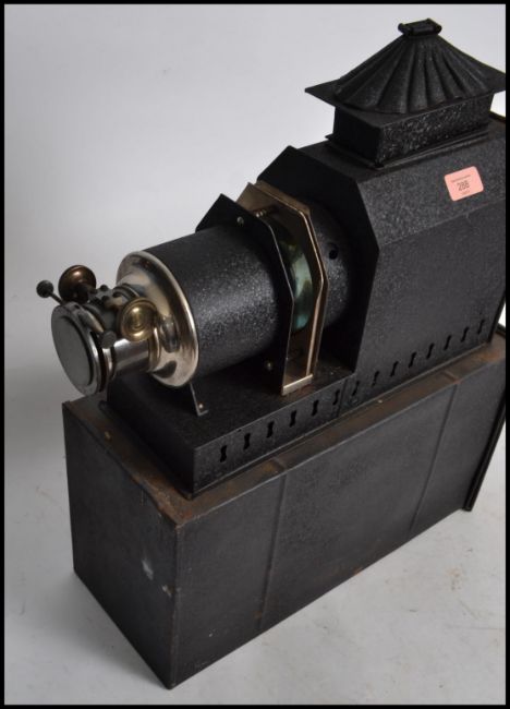 A vintage 20th century magic lantern slide viewer of metal tin construction having an ebonised painted finish set within a matching metal case.