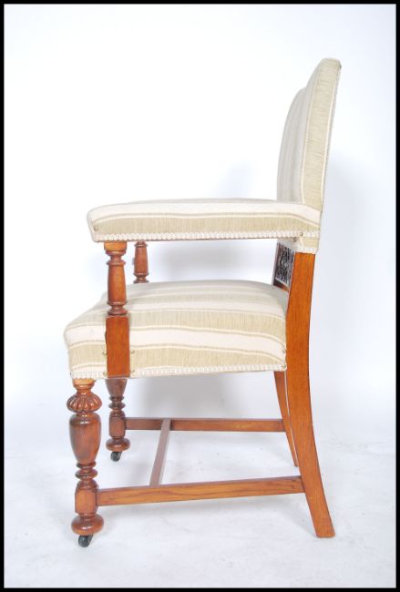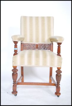 An early 20th century carved oak throne armchair raised on turned legs with h-stretchers having stripe fabric to the seat, back rest and shaped elbow supports