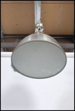 A set of 3 original 20th century BTC aluminium Industrial pendant lights / factory lighting. Each spherical shade with light fittings to each 49x37cm