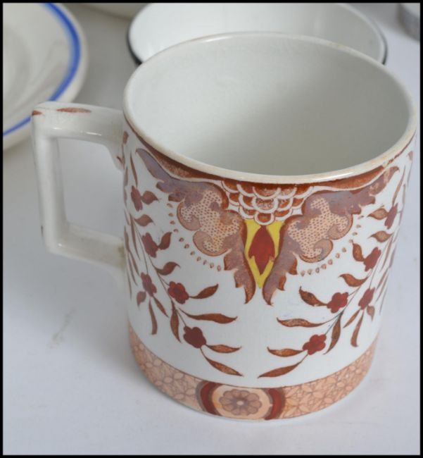 A good collection of Bristol ceramics by Pountney. To include large oversize mug and bowl set, pair of graduating bowls, mug and a Hellenic Lines Ltd shipping line plate marked for Piraeus.  Measures: 27cm wide.