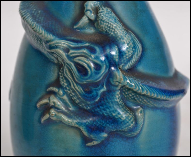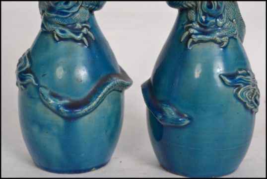 A pair of 18th / 19th century Chinese monochrome vases / pourers embellished with dragons chasing a flaming pearl. Both with early repair. Measures: 20cm high