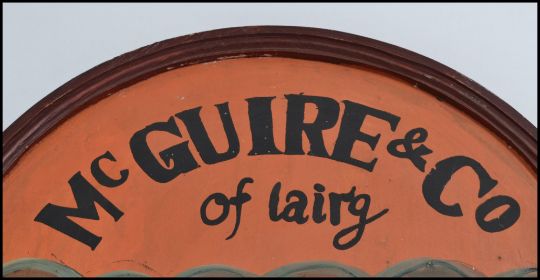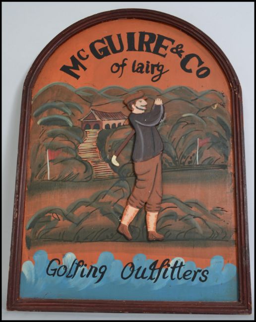 A reproduction 20th century Scottish wooden golf sign for McGuire and Co of Lairg Golfing Outfitters depicting a golfer in swing with text to top. Measures: 70cm high.