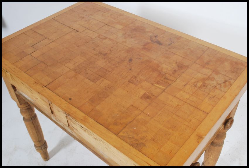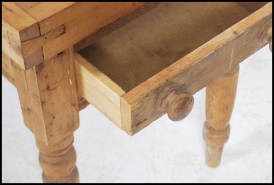 A 19th century scrubbed pine kitchen table having a later butchers block top, raised on turned legs with a single drawer. 105cms x 64cms x 60cms