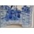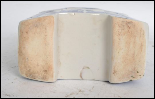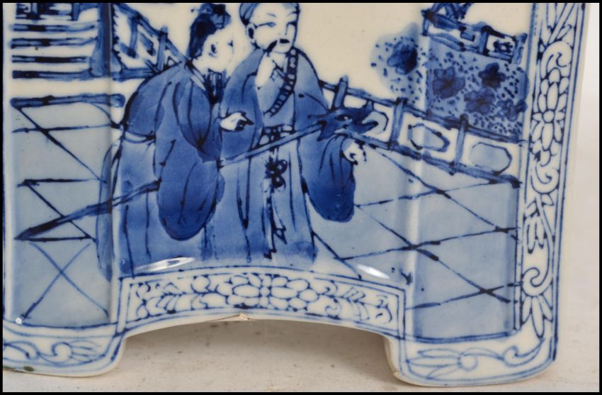 A 19th century Chinese blue and white tea caddy ( missing lid ) pagoda in shape decorated blue panels on white ground  with coujrt scenes to the front and rear and character mark panels to the side. Measures: 14cm wide.