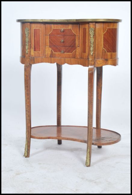 A French Marquetry Inlaid Kidney Shaped Side Table, with brass gallery above a series of frieze drawers, raised upon cabriole legs with under tier. 72cms x 56cms x 32cms