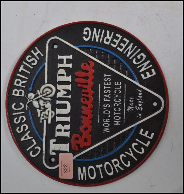 A vintage style advertising point of sale motoring plaque sign for Triumph Motorcycles of circular form having bold lettering. Measures:  25cm wide.