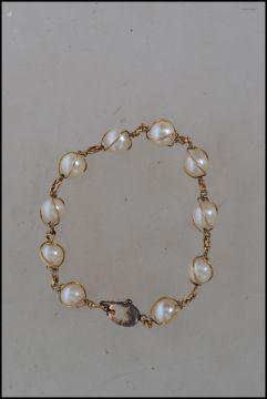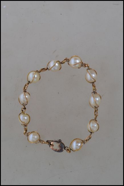 A vintage 18 carat gold pearl bracelet chain having pearl spacers set in gold twist mounts having a tab insert catch. Stamped 18k weighs 10.8 grams.