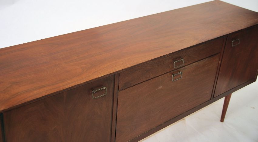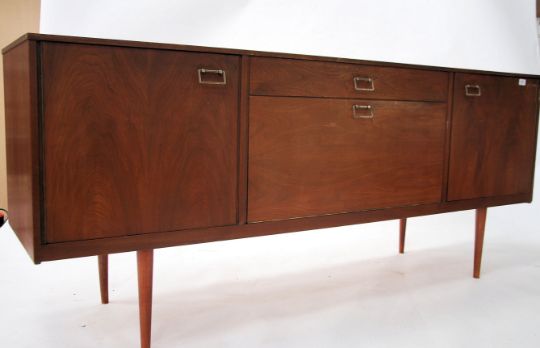 A good 1970's retro Danish influence teak wood sideboard raised on angular legs with a series of drawers and cupboards to the wide body with fall front cocktail cabinet to the centre. Measures: