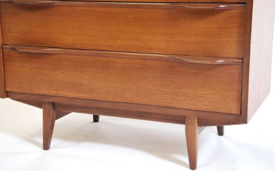 A good 1970's Danish inspired teak wood bureau being raised on angled supports with a central bank of drawers under fall front slope with appointed interior. Arched upper handles to each drawers and slope