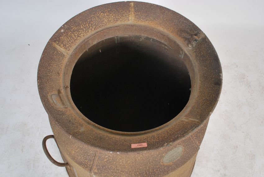 A large early 20th century agricultural farm VAT of pressed metal form having a wooden base with tapering cylinder and carry handles