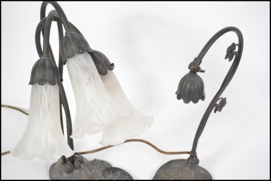 A pair of contemporary Art Nouveau inspired table lamps in the form of ladies one fitted with glass shades. Tallest 44cms high.