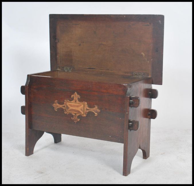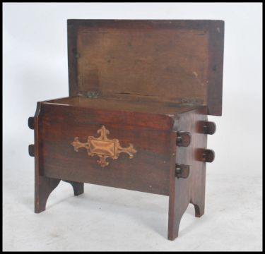 A vintage early 20th century oak blanket box coffer chest being peg jointed having a hinged flared panel top opening to reveal a spacious interior with a blind fret worked panel to front raised on shaped legs. Measures 48cms x 71cms x 38cms