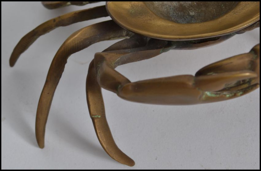 A vintage mid 20th century brass nautical novelty ashtray in the form of a crab having lift up lid to tray with removable compartment.