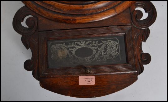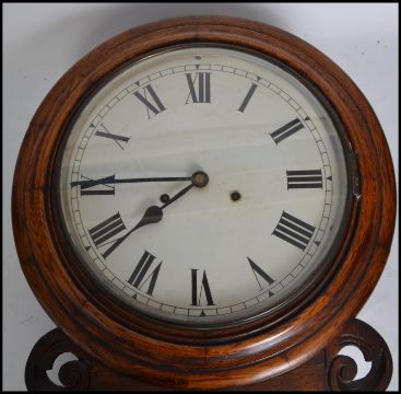 A 19th century American mahogany wall clock with Roman numerals, crossbanding and carved decoration to case.