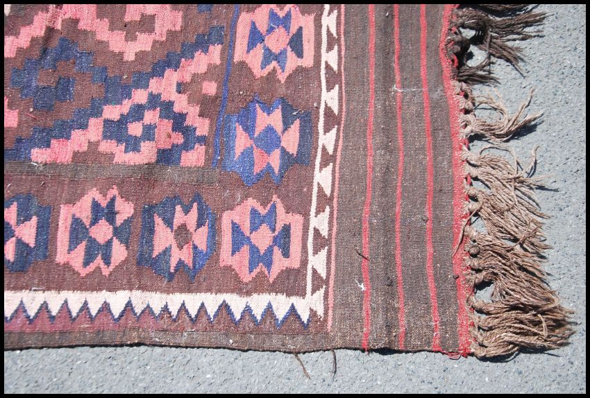 A large Afghan / Persian handwoven kilim rug of black and red ground with geometric patterns and tassled ends. Measures 300cms x 150cms