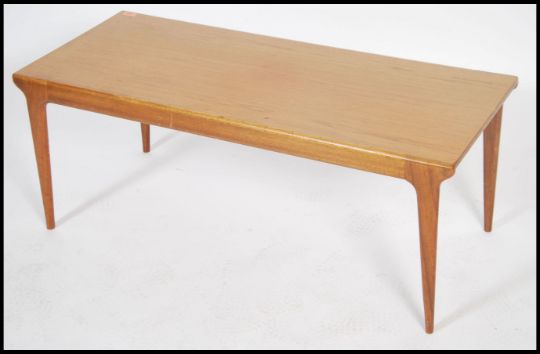 A good Danish 1970's retro rectangular coffee table raised on rounded edge tapering legs with good top above