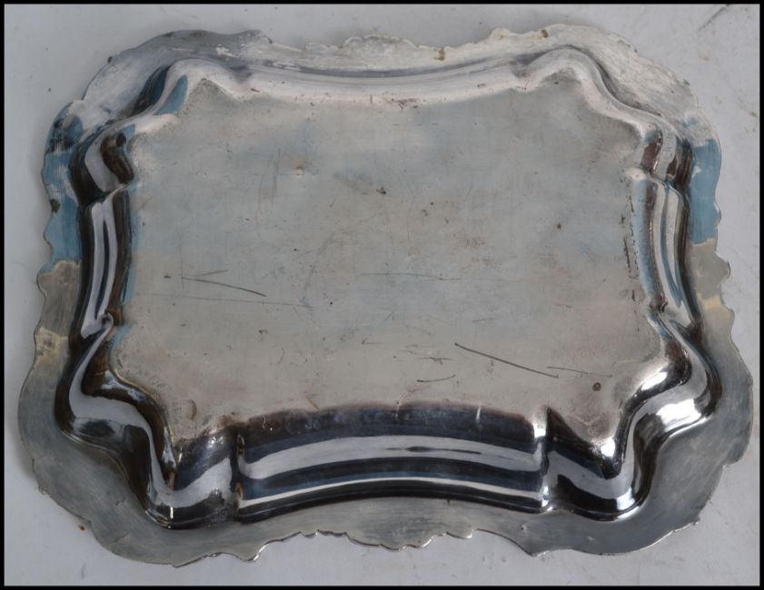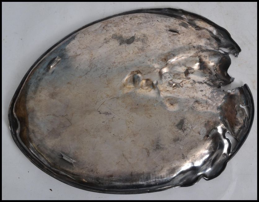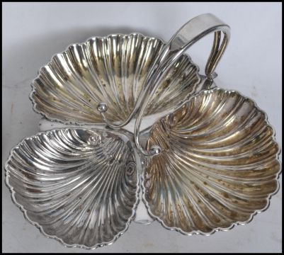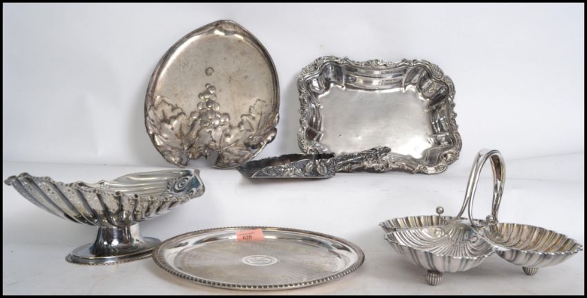 A group of silver plated wares to include a Kaiser Tirol art nouveau oval tray, a trefoil clam shaped sectional dish. a bon bon dish in the form of shell etc. Measures 32cms wide.