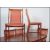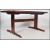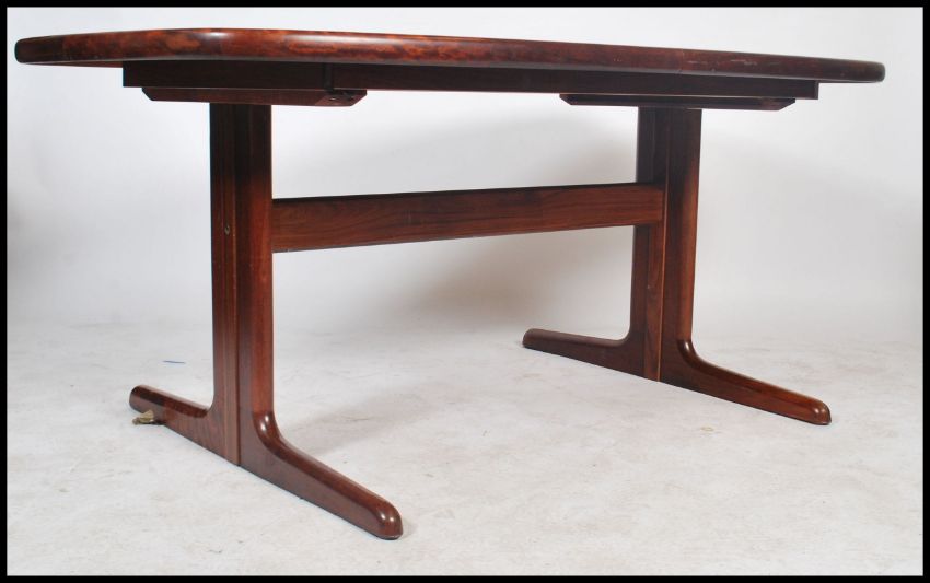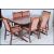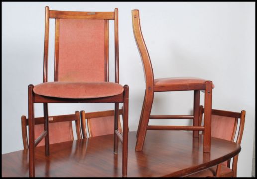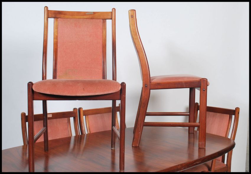 A 1960's retro Danish teak D - end extending dining table, with six matching teak wood dining chairs having upholstered fabric seat pads and back rests.