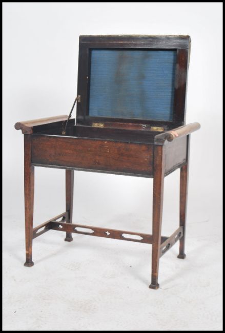 An Edwardian mahogany piano stool having a pierced h-frame stretcher under a hinged top seat with music sheet storage box to the underside. 52cms x 57cms x 36cms