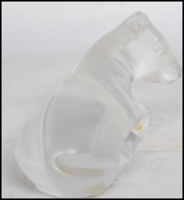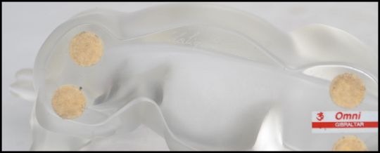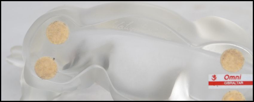 Lalique frosted glass paperweight formed as a recumbent cow, having acid etched inscription to the base.Measures: 13cm wide.