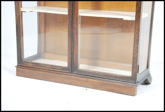 A vintage 20th century  oak china display cabinet having a pair of glazed doors with a series of shelves to the inner raised on shaped legs. Measures 120cm x 91cm x 30cm