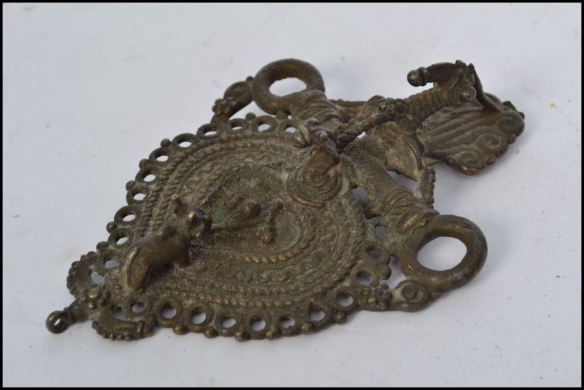 An unusual Anglo - Colonial Indian  white metal - brass metal Indian chastity belt buckle of armorial shaped form and with hammered decoration