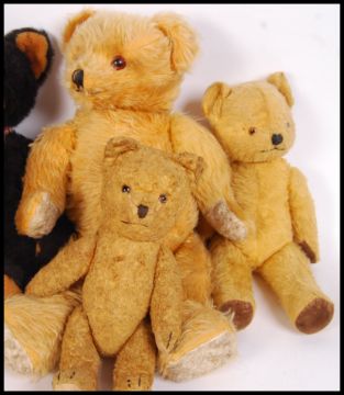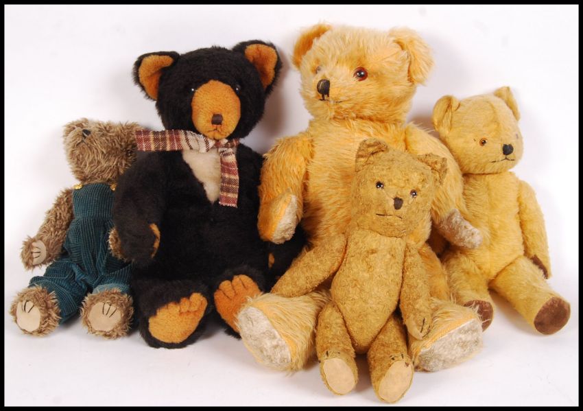 A collection of 5x 20th century vintage stuffed teddy bears to include; bear in dungarees, 3x golden mohair coloured bears &  Dean's Childsplay Toys dark brown bear.