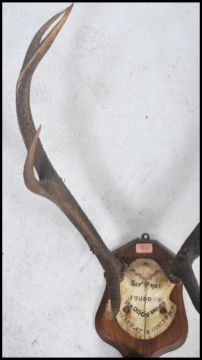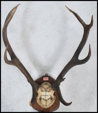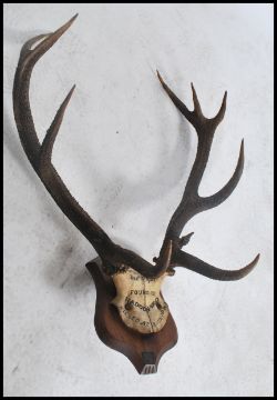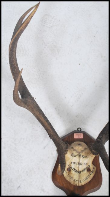 A good set of early 20th century mounted deer antlers bearing notation for 1921 to the skull and mounted to an armorial shaped wall plaque 84x63cm. Marked Found in Haddon Wood Sept 1921 Killed in BringTown