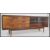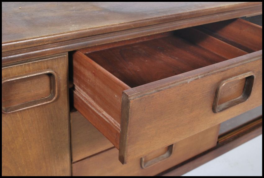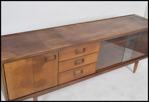 A 1970's retro teak wood sideboard being raised on tapering legs with a wide and low body comprising a central bank of drawers with cupboard and sliding glass door display cabinet