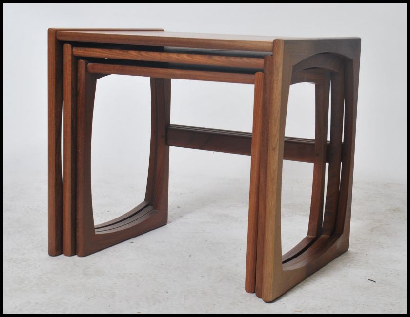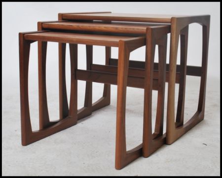 Two sets of G-Plan retro teak wood 1970's graduating nest of tables in the Quadrille pattern. The tables having angular legs united by reverse stretchers with graduating table tops above. 49c54x43cm