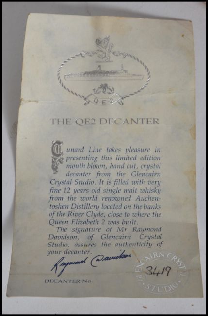 AUCHENTOSHAN Auchentoshan aged 12 years QE2 Glencairn crystal decanter . Dalmuir, Dunbartonshire.Commemorative Glencairn crystal decanter to celebrate the ' Queen Elizabeth 2nd ' ocean liner, distilled and bottled by Morrison Bowmore Ltd, decanter no. XXXX. In presentation case with crystal stopper. 1 litre, 43% volume.