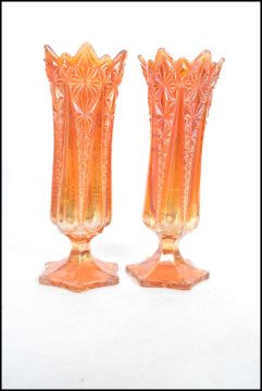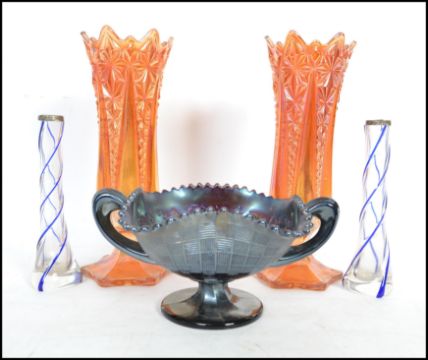 A pair of early 20th century orange lustre carnival glass vases together with a purple irridescent glass carnival bowl being twin handles, possibly Fenton Together with a pair of silver collared solifleur spiral twist vases