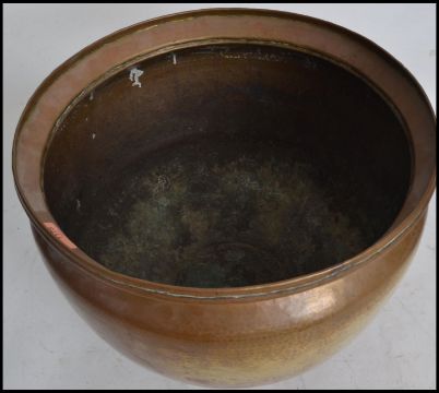 A very large 20th century heavy unusual hand beaten Arts and Crafts style copper / brass vase copper vase / planter / stick stand of bulbous form.
