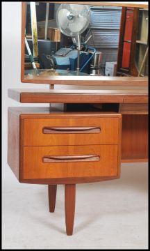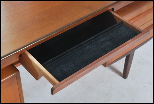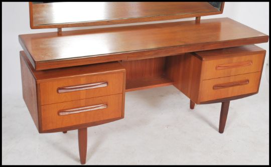 A 1970's G-Plan teak wood dressing table in the manner of Mogens Kolo. The dressing table raised on angular legs with pedestal banks of drawers, dressing top with mirror to centre. Together with the matching stool. Measures: 120cms high x 152cms wide x 46cms deep.