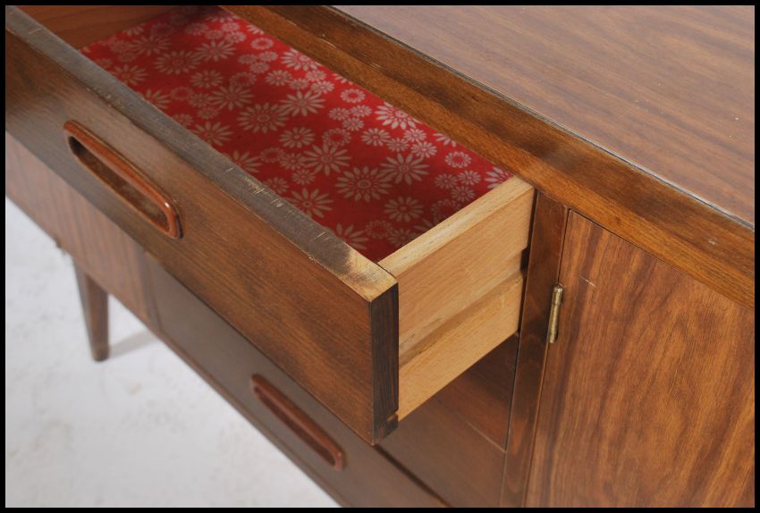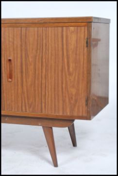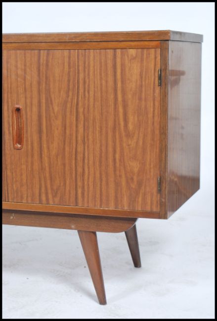 A retro 20th century teak wood sideboard consisting of a series of drawers and cupboards raised on tapered legs.