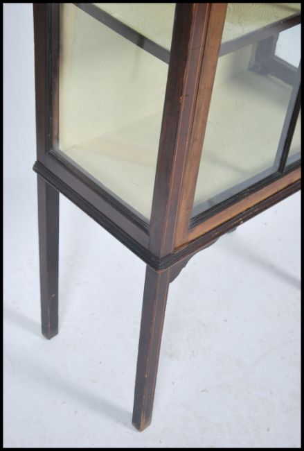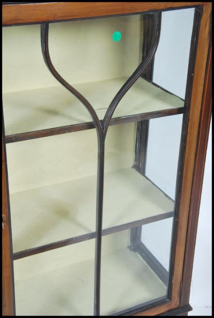 An Edwardian mahogany inlaid display cabinet having single astragal glazed door raised on square tapered legs with spade feet. Measures 139cm high x 59cm wide x 31cm deep