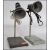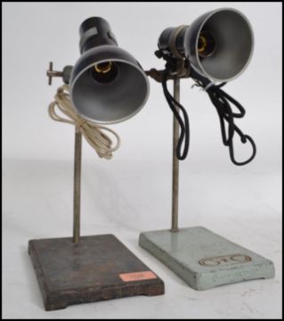 A pair of stunning vintage mid 20th century industrial lab stands raised on a cast metal base and each supporting a vintage bakelite inspection lamp.