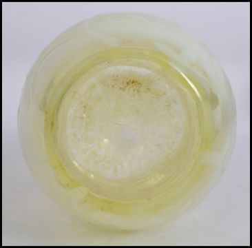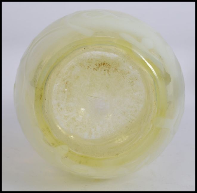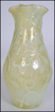 An early 20th century Uranium irridescent glass vase with fabulous floral design with handkerchief neck having polished base, all in the manner of Bagley. Measures 25cms high