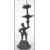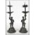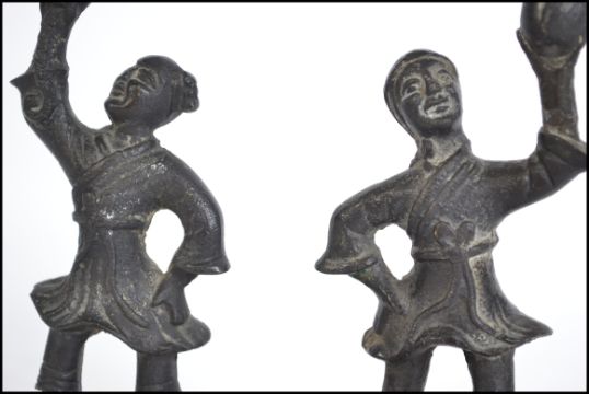 A pair of 19th century Oriental bronze candlesticks in the form of figure raised on pedestal bases the figures holding the central columns with sconces to top.