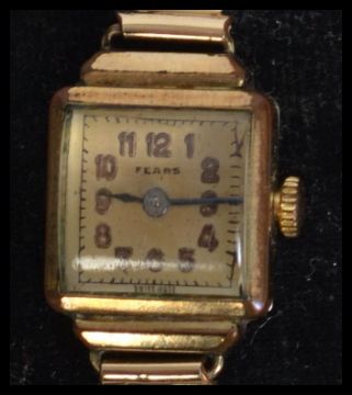 A vintage ladies cased rolled gold cocktail dress watch by Fears of Bristol. Together with a cased Walker & Hall pocket watch and albert chain. Also an unusual articulated expanding ladies theatre penny purse with woollen woven purse on brass mechanism